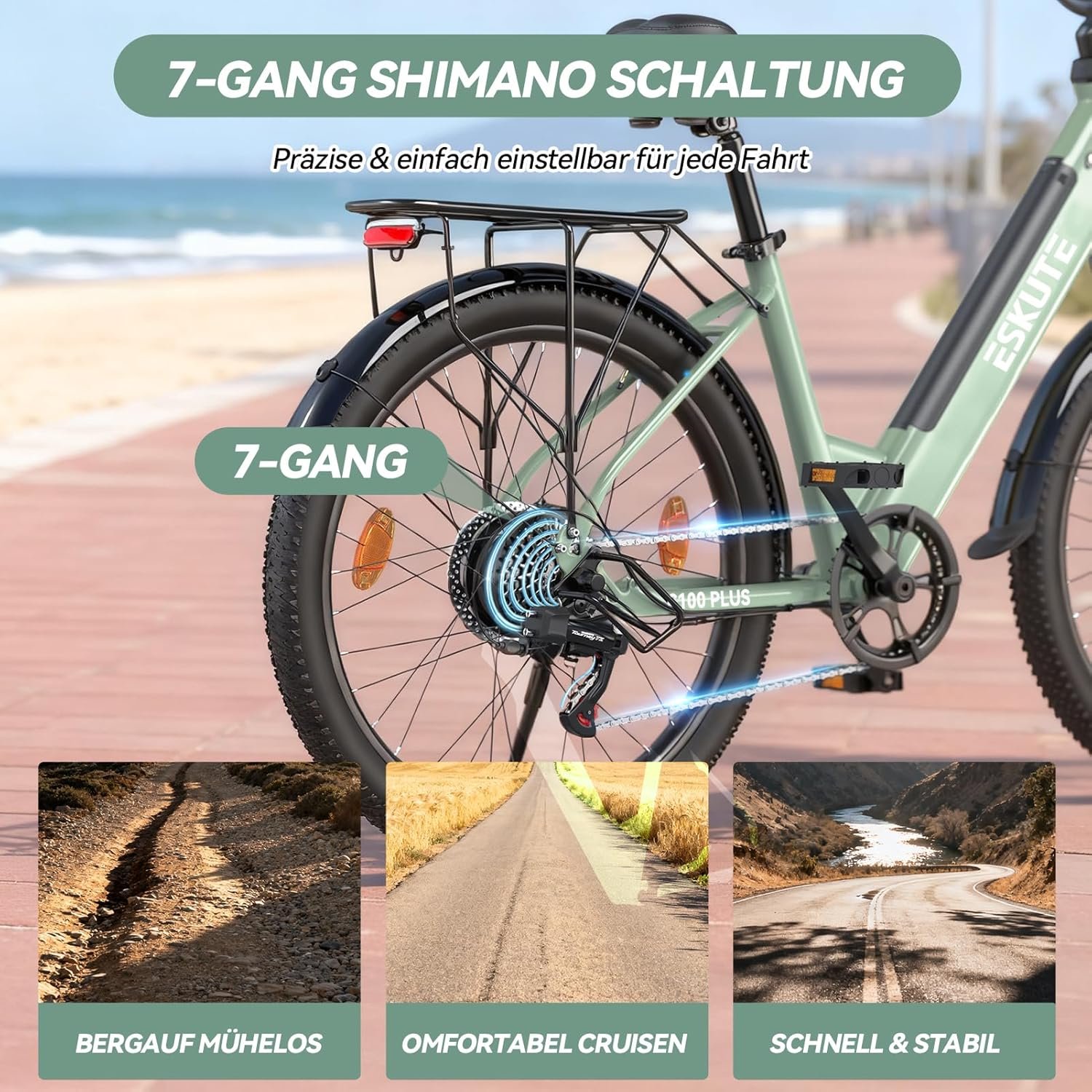 • Sanftes Schalten & Kontrolle: Mit dem präzisen 7-Gang-Getriebe passen Sie Ihren Fahrstil jeder Situation an – ob beim entspannten Cruisen auf ebener Strecke oder beim kraftvollen Klettern an Hügeln.