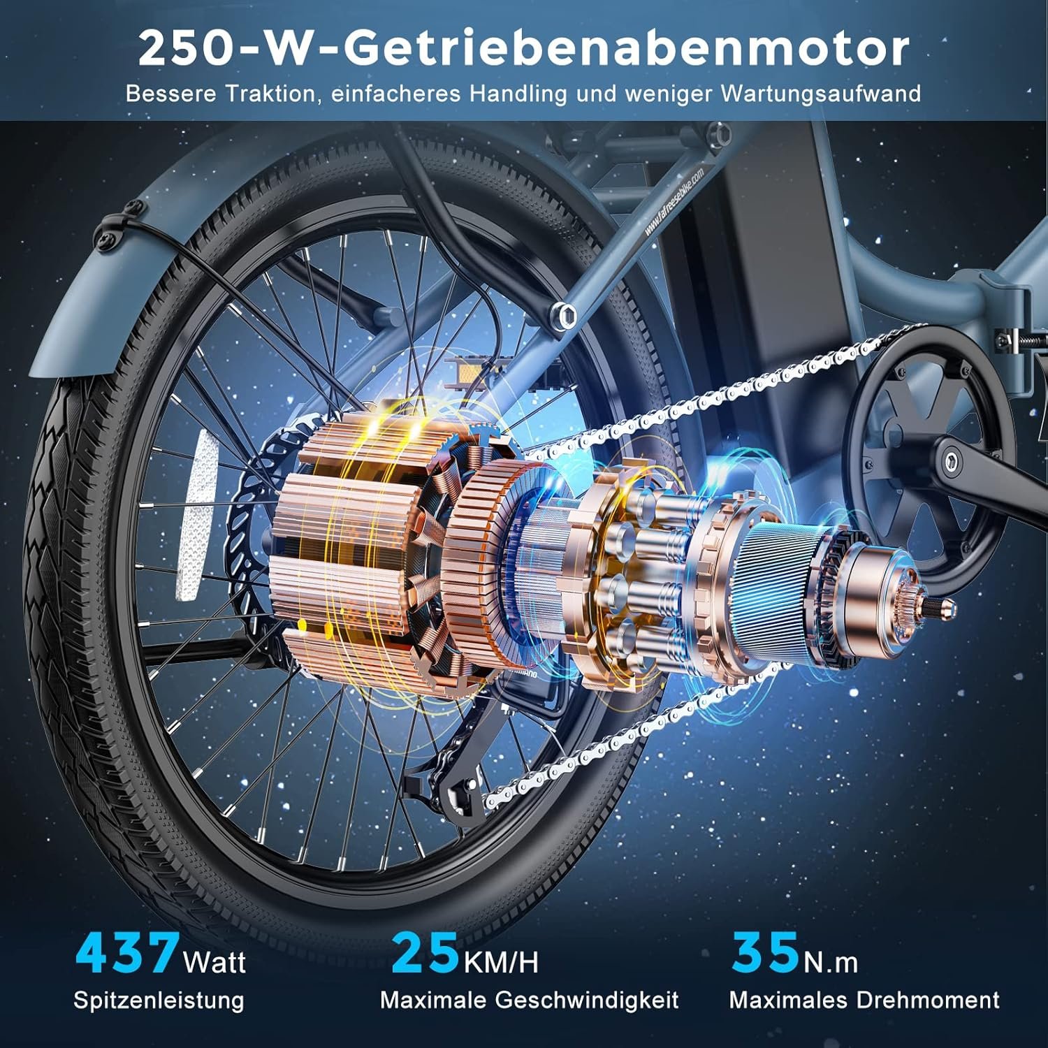 Effizienter Antrieb: Ein wartungsarmer 250W bürstenloser Heckmotor (35 Nm) sorgt für eine konstante Höchstgeschwindigkeit von 25 km/h, optimale Traktion und meistert Steigungen bis 20°.